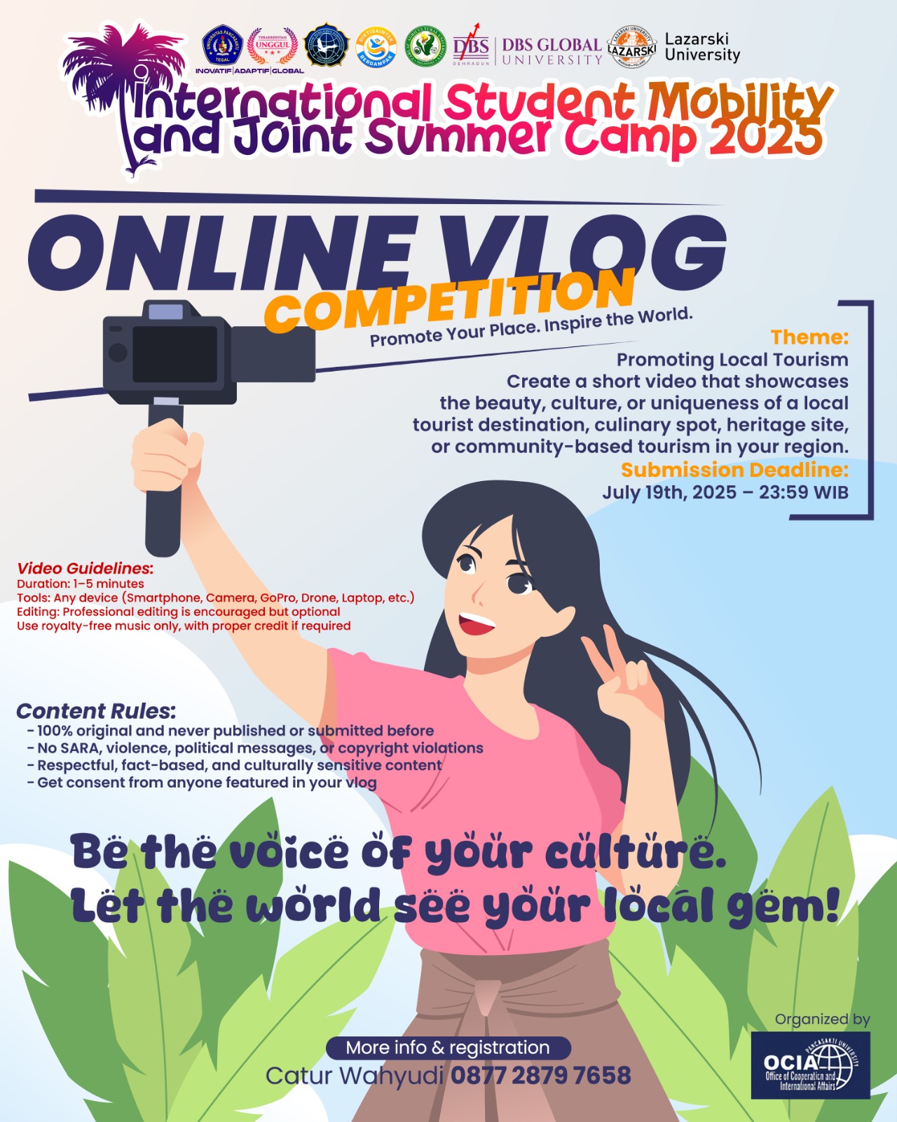 Ayo para kreator & inovator! Kompetisi Desain Poster Online, Fotografi, Esai, dan Vlog adalah kesempatanmu untuk menampilkan karya di panggung internasional! Baik kamu seorang penulis, seniman, fotografer, atau kreator konten—ini saatnya kamu bersinar.